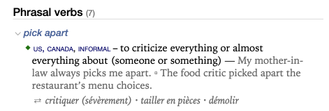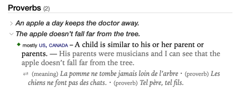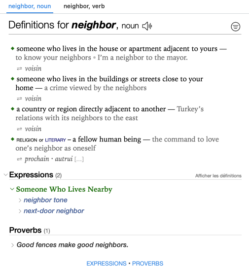 - les proverbes (Proverbs), ces expressions qui placent le mot recherché en contexte et sont une porte essentielle sur la signification globale d’un mot.