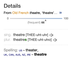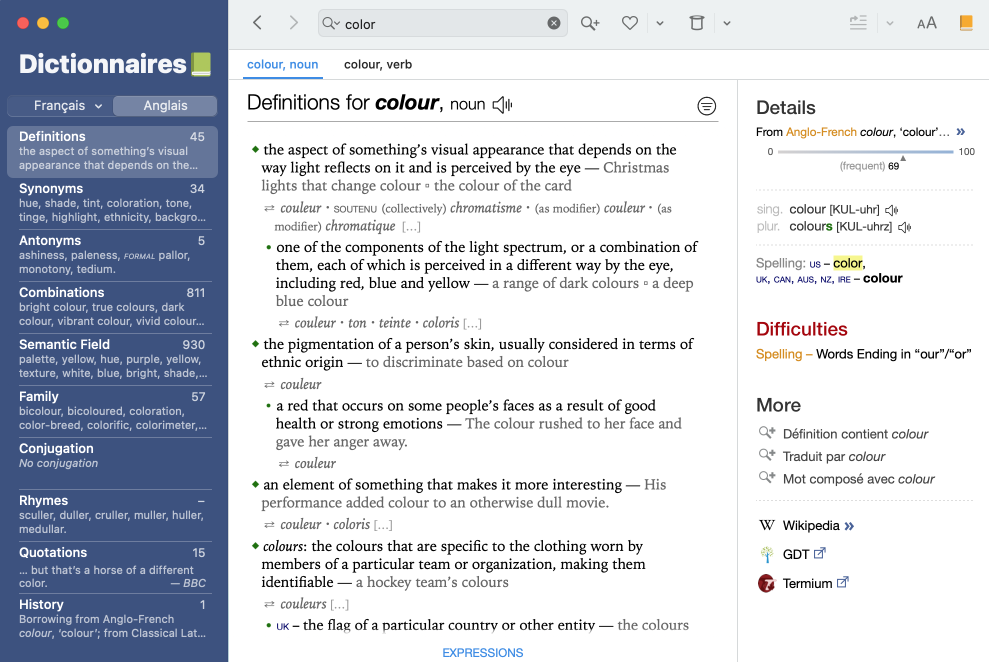 Rappelons enfin qu’un résumé de l’étymologie d’un mot anglais apparait dans la section Details du panneau des précisions du dictionnaire de définitions. Le symbole permet d’accéder au dictionnaire historique.