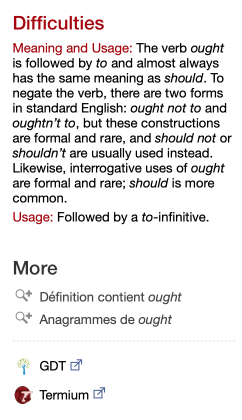 Les locutions sont affichées en caractères bleus ou noirs et sont précédées d’un chevron de dévoilement permettant l’affichage ou le masquage rapide de la définition. Cliquez sur une locution en bleu pour l’afficher en entrée et en découvrir le contenu (synonymes, cooccurrences, citations, etc.). Les locutions affichées en noir sont accompagnées d’informations supplémentaires sur leur emploi : flexion, notes, compléments de recherche, etc. Cliquez sur le bouton pour faire apparaitre une bulle d’informations supplémentaires.
