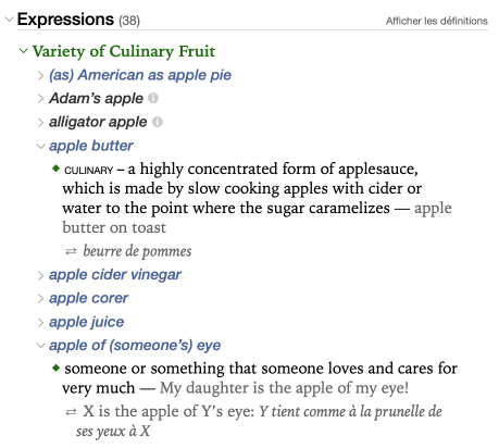 - les locutions (Expressions), qui peuvent être transparentes et figurées, c’est-à-dire des locutions dans lesquelles le mot vedette conserve son sens premier (ex. : dans l’expression transparente apple butter, le nom anglais apple conserve son sens de « fruit ») ou dans lesquelles le sens du mot vedette comporte une certaine valeur métaphorique ou métonymique qui l’éloigne de son sens premier ou habituel (ex. : dans la locution figurée apple of (someone’s) eye, qui désigne « une personne à qui l’on tient beaucoup », le nom anglais apple a perdu son sens propre);