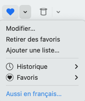L’ajout et le retrait de favoris et de listes de mots personnalisées s’effectuent de la même façon dans les dictionnaires anglais et français (voir le chapitre Les dictionnaires). Notamment, la commande Modifier…, que l’on actionne en cliquant sur le chevron à droite du cœur (bouton des favoris), ouvre la fenêtre Favoris, qui présente de façon distincte les listes anglaises et françaises, et qui offre plusieurs options de gestion de celles-ci. Dans le menu des favoris, la commande Aussi en français/anglais… permet d’alterner entre les listes anglaises et françaises.
