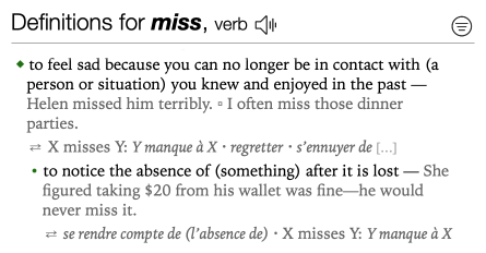 Formulations précisées — Une traduction peut être précédée d’une formulation en langue d’origine (en caractères romains et suivie d’un deux-points) où le mot vedette est présenté dans une construction particulière. Par exemple, l’une des traductions du verbe anglais miss (au sens de « s’ennuyer de ») est précisée ainsi : X misses Y : Y manque à X. La mention permet ici d’attirer l’attention sur l’inversion de la construction syntaxique qui se produit quand on passe d’une langue à l’autre.