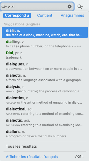 Le menu de recherche à la frappe apparait dès que vous commencez à saisir des lettres dans la vedette et offre, à mesure que vous tapez, les résultats de recherche les plus pertinents. Pour plusieurs expressions, les dictionnaires d’Antidote peuvent aussi offrir des résultats dans l’autre langue; pour les consulter, il suffit de sélectionner Afficher les résultats français dans les dictionnaires anglais ou Afficher les résultats anglais dans les dictionnaires français, qui apparaissent à la fin du menu.
