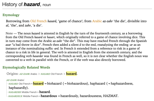 Le dictionnaire historique donne l’étymologie détaillée de nombreux mots, accompagnée dans la plupart des cas d’une liste hiérarchique de parents étymologiques (Etymologically Related Words) et, parfois, d’une remarque explicative (Note).