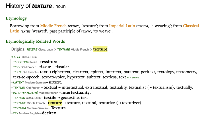 - les parents étymologiques (Etymologically Related Words), qui constituent à partir de l’étymon principal à l’origine du mot vedette une sorte d’arbre généalogique de sa descendance étymologique. Par exemple, pour le mot anglais texture (du latin classique texere, « tisser », en passant par le latin impérial et le moyen français), les parents étymologiques affichent l’italien tessitura (qui donne l’anglais tessitura), l’ancien français tissu (qui donne l’anglais tissue), l’ancien français texte (qui donne l’anglais text, puis subtext, textbook, hypertext, etc.)… Ces mots partagent donc un étymon commun : le verbe latin texere, « tisser ». Pour clarifier la liste des parents étymologiques, une ligne Origins est aussi incluse, qui indique séquentiellement, de l’étymon le plus ancien au plus récent, les grandes étapes étymologiques du mot traité. Le symbole > peut y être lu comme signifiant « donne lieu à, engendre, forme ».