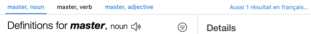 Lorsque le mot en vedette a des homographes, comme le mot master, qui, en anglais, est à la fois un nom, un verbe et un adjectif, ceux-ci s’affichent dans la barre des homographes située au-dessus de l’entête de tous les dictionnaires. Pour certaines recherches, des résultats existent dans les deux langues; les options Aussi n résultats en français et Aussi n résultats en anglais permettent de consulter les résultats offerts pour l’autre langue.