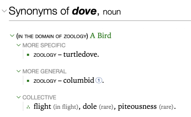 - les hyponymes, hyperonymes et noms collectifs, identifiés respectivement par les titres MORE SPECIFIC, MORE GENERAL et COLLECTIVE. Les listes d’hyponymes et d’hyperonymes sont précédées d’un carré vert plein (◼︎) et les noms collectifs d’une puce en trois points (⸫). Lorsqu’un hyponyme (ou un hyperonyme) affiché possède lui-même des hyponymes, le nombre de ceux-ci est indiqué dans un cercle bleu affiché à sa droite. Un clic sur le cercle dévoilera la liste complète de ses hyponymes. Le processus peut être récursif si certains de ceux-ci possèdent eux-mêmes des hyponymes;