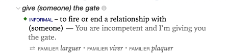 Marques d’usage — Le cas échéant, les traductions sont dument accompagnées de leurs marques d’usage. Par exemple, la locution anglaise familière give (someone) the gate est traduite par les équivalents virer, plaquer et larguer, qui sont précédés de la marque FAMILIER. En général, les traductions données sont du même niveau de langue que celui de l’expression à traduire.