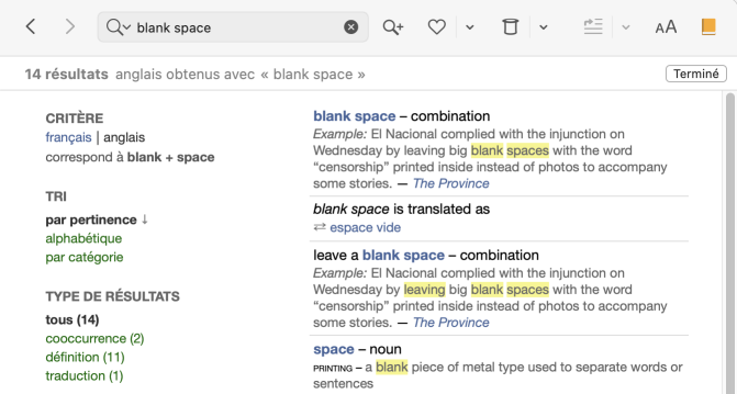 Exemples et définitions — Lorsque la traduction figure elle-même dans le dictionnaire de cooccurrences de l’autre langue, elle est suivie du signe >, comme c’est le cas de notre exemple récolte abondante. Dans ce cas, un clic sur la traduction affichera dans le panneau de droite les définitions ou les exemples reliés à la cooccurrence française récolte abondante. Pour alterner entre les exemples et les définitions, utilisez les boutons situés en bas de ce panneau. Lorsque la traduction ne figure pas elle-même comme cooccurrence (absence du signe >), un clic sur la traduction affichera dans le panneau de droite les définitions de ses mots constituants. Par exemple, pour la cooccurrence anglaise harvest of the sea, un clic sur sa traduction récolte de la mer affichera à droite les définitions des mots constituants, récolte et mer.