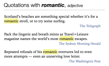 Le dictionnaire de citations anglaises offre une très vaste compilation de phrases provenant de grands auteurs, de grands journaux et de Wikipédia afin d’illustrer les emplois du terme recherché. Chaque citation dispose d’une référence avec un lien Web (en bleu) : cliquez-le pour accéder à la page de présentation de l’œuvre ou à la page d’accueil du site source de la citation.