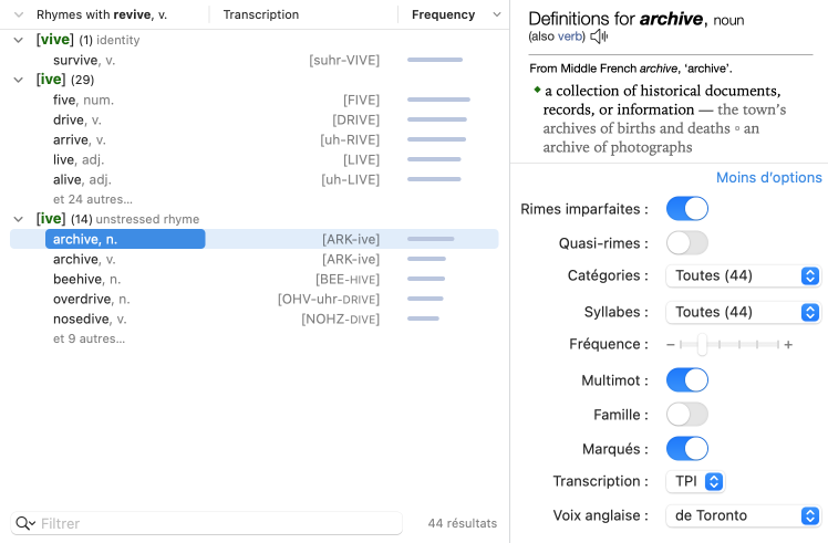 Des paires de mots qui ne respectent que partiellement ces critères peuvent constituer des rimes, mais celles-ci sont alors dites imparfaites (imperfect rhymes). C’est le cas pour la paire de mots revive et survive, où la consonne qui précède la voyelle tonique i est identique, soit ici un v. Le mot revive rime aussi imparfaitement avec archive, la raison étant cette fois-ci que ce n’est pas sur la même syllabe que porte l’accent principal (dernière syllabe dans revive, première syllabe dans archive). Les rimes imparfaites de ces deux types (appelés respectivement identity et unstressed rhyme) peuvent être affichées grâce à l’option d’affichage Rimes imparfaites (Imperfect rhymes).