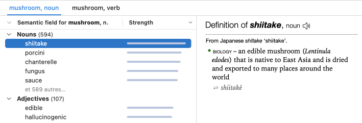 Le dictionnaire de champs lexicaux présente l’ensemble des mots anglais sémantiquement apparentés au mot en vedette. Ils sont regroupés par catégories grammaticales (noms, adjectifs, verbes) et classés par force relative.