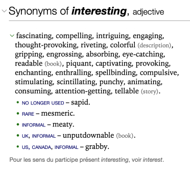 - les contextes, en gris et entre parenthèses, qui précisent le contexte d’emploi du synonyme (ex. : unputdownable (book) comme synonyme du mot interesting);