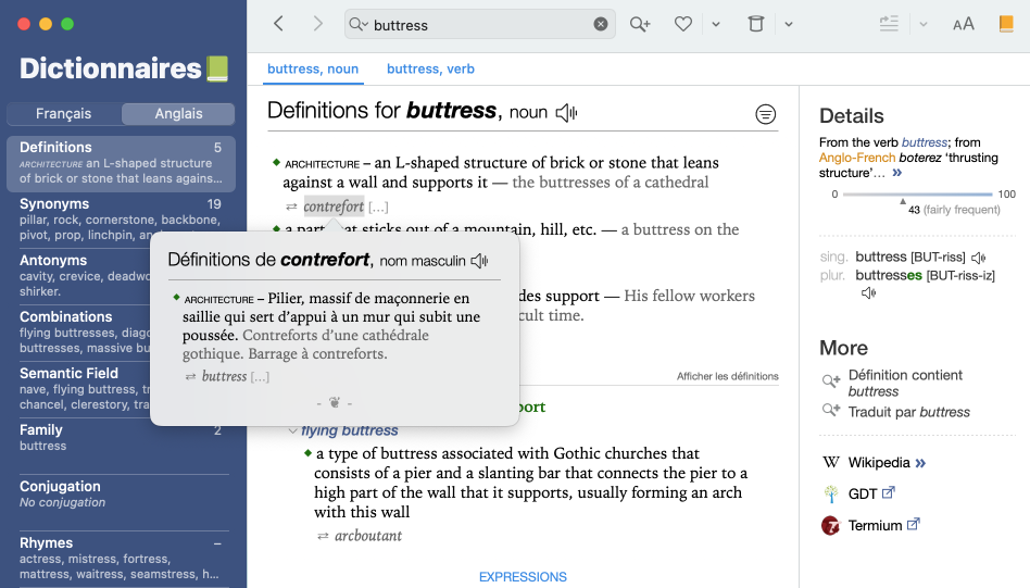 Par exemple, sous le nom anglais buttress, chacune des trois définitions est suivie de traductions, et l’on voit que, dans le domaine de l’architecture (première définition), buttress a pour traduction française le nom contrefort. Un simple clic sur cet équivalent affiche dans une infobulle la définition architecturale de contrefort telle qu’elle figure dans les dictionnaires français d’Antidote, ce qui permet à l’utilisateur de comparer le contenu des définitions anglaise et française. Un doubleclic sur l’équivalent amène l’utilisateur à l’entrée de dictionnaire de cet équivalent.