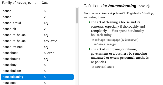 Le dictionnaire anglais de familles présente tous les mots de la famille morphosémantique à laquelle appartient le mot en vedette. Lorsque le mot en vedette présente des sens suffisamment distincts, un trait horizontal gris sépare les familles liées à chacun d’eux.
