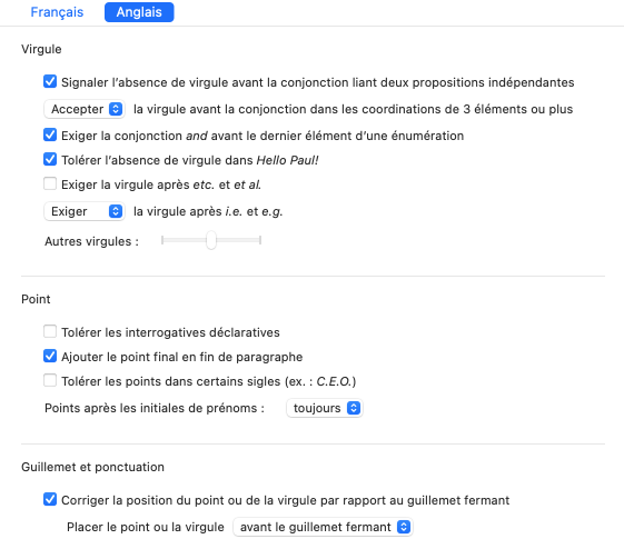 Ce réglage permet d’exiger ou de refuser la virgule après i.e. et e.g., ou encore d’accepter les deux emplois.
