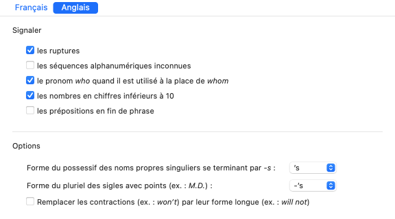 Si cette option est cochée, Antidote révèle les contractions (ex. : won’t) et propose de les remplacer par leur forme longue (ex. : will not). Les contractions sont déconseillées par certains guides de style dans les contextes soignés.