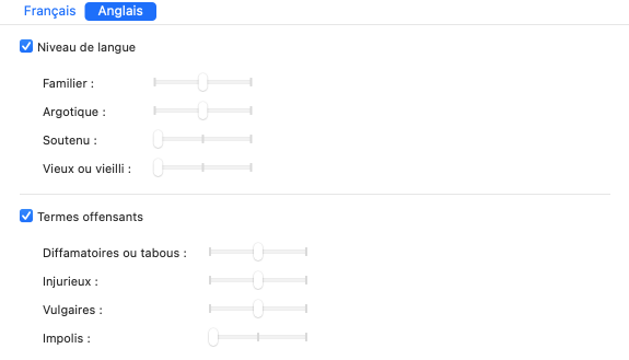 Les termes jugés offensants ou fortement inconvenants sont aussi reconnus par le correcteur et évalués suivant vos réglages. Il peut s’agir d’expressions considérées comme diffamatoires ou taboues (midget pour « personne de petite taille »), injurieuses (slut pour « femme de mœurs légères »), vulgaires (piss pour « urine ») ou impolies (fatty pour « personne obèse »).