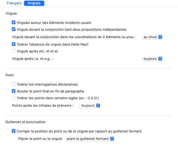 Ce réglage permet d’exiger (option toujours) ou d’empêcher (option jamais) la virgule après i.e. et e.g., ou encore de tolérer les deux emplois (option au choix).