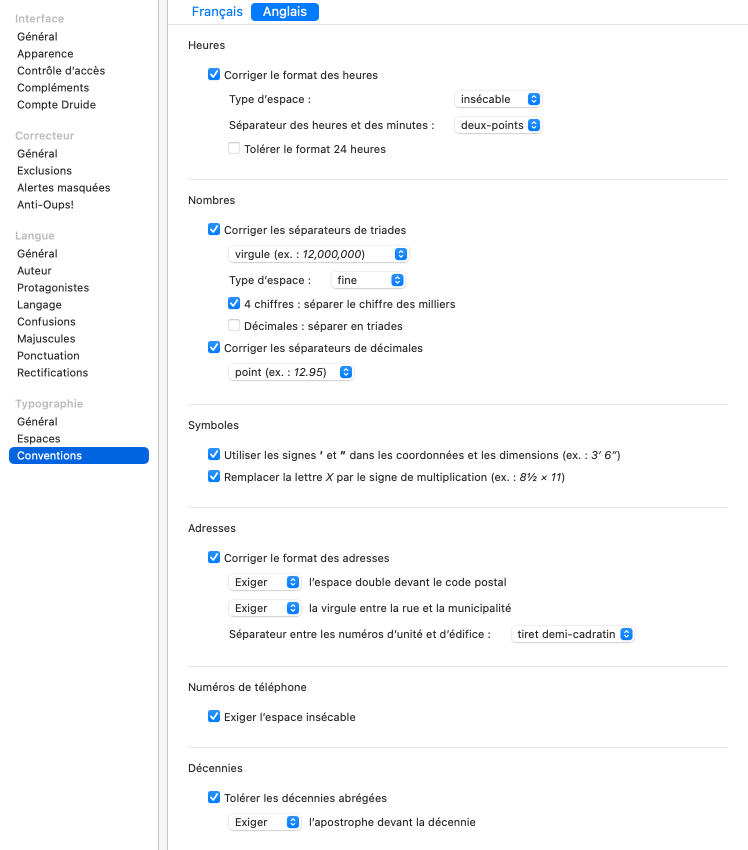 Les réglages du panneau Conventions anglais ont le même effet que ceux de leur équivalent français, mais restent distincts pour permettre de les ajuster différemment pour l’anglais. Le format normal en anglais des nombres, des heures et des adresses est en outre assez différent de celui du français.