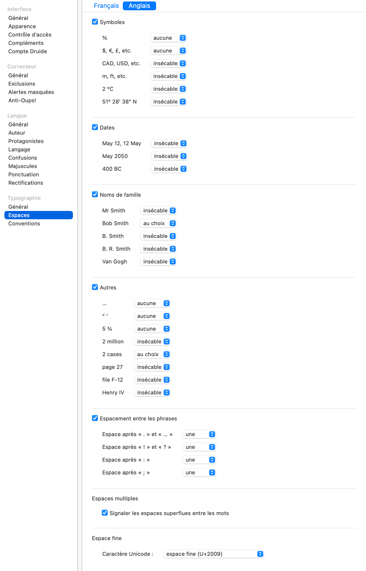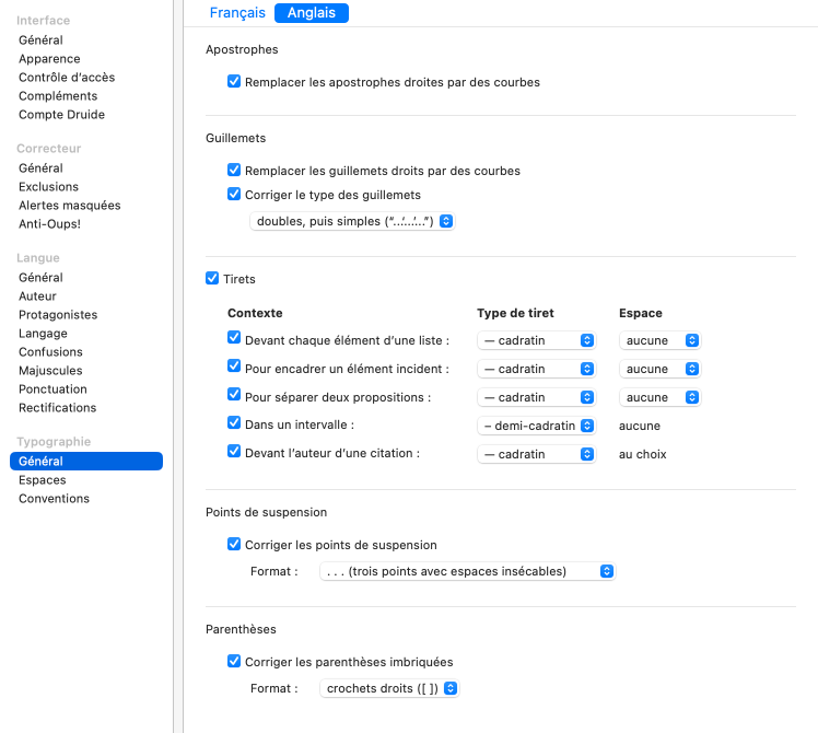 Les réglages suivants sont par ailleurs propres à la correction de l’anglais.