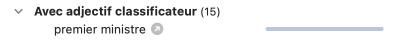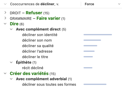 Lorsqu’un mot possède plusieurs sens, les cooccurrences sont regroupées par sens. Dans ce cas, les sens sont affichés en vert, accompagnés d’un chevron de dévoilement.