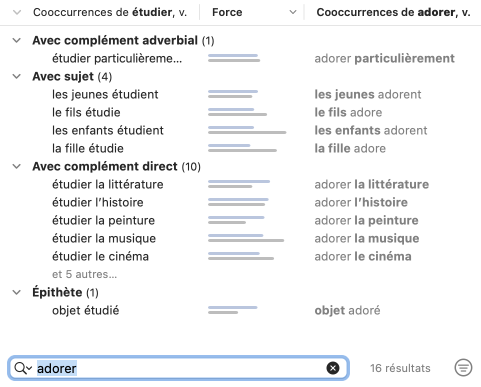 Certaines cooccurrences sont aussi des locutions qui possèdent elles-mêmes des cooccurrences. Pour consulter les cooccurrences d’une locution, appuyez sur le bouton de mise en vedette ().