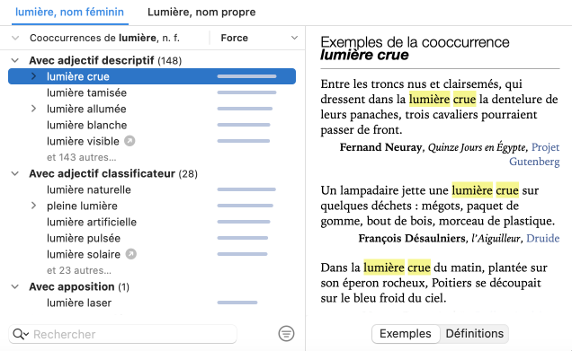 Les cooccurrences du mot en vedette sont présentées en liste verticale. Dans certains cas, des sous-cooccurrences plus longues, comme apparaitre en pleine lumière, sont regroupées sous une cooccurrence qu’elles contiennent, comme pleine lumière. Vous pouvez sélectionner une cooccurrence particulière, puis utiliser le bouton de remplacement ( dans la barre d’outils) pour l’insérer dans votre texte. Lorsqu’un déterminant particulier figure dans une cooccurrence (répandre la lumière, jeter une lumière), c’est que ce déterminant est significativement plus fréquent dans ce cas. De même, une cooccurrence peut être fléchie au féminin ou au pluriel si elle se présente plus souvent ainsi dans la langue. Vous pouvez parcourir les cooccurrences au moyen des flèches verticales du clavier et dévoiler les sous-cooccurrences à l’aide des flèches horizontales.