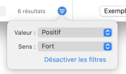 Cliquez sur le bouton à droite du filtre de recherche pour filtrer la liste des cooccurrences en fonction de leur valeur (Positif ou Négatif) et de leur sens (Fort ou Faible). En restreignant l’affichage à de plus courtes listes, ces filtres aident à choisir les cooccurrences les mieux adaptées à vos besoins. Pour retrouver l’affichage de tous les résultats, cliquez de nouveau sur le bouton des filtres, puis sur Désactiver les filtres.