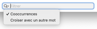 Le filtre de recherche permet de rechercher une suite de caractères dans la liste des cooccurrences. Tapez simplement ces caractères, en vous assurant que l’option Cooccurrences est sélectionnée dans le menu de la loupe. Une fois votre évaluation terminée, cliquez sur le bouton « x » à droite de la zone de recherche pour retrouver la liste complète ou procéder à une nouvelle recherche.