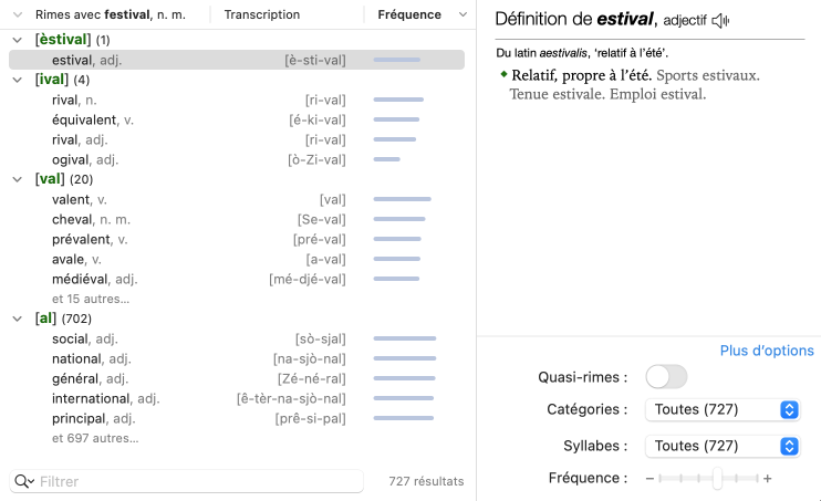 Le panneau principal affiche les résultats, disposés en trois colonnes et divisés en sections regroupant chacune tous les mots se terminant par la même suite de phonèmes. Cette finale phonétique représentée en vert entre crochets sert de titre à chaque section et est accompagnée d’une indication du nombre de résultats. Les sections se succèdent en ordre décroissant de richesse de la rime (nombre de phonèmes communs).