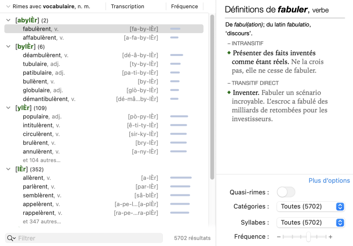 La deuxième colonne montre entre crochets la transcription du mot en alphabet phonétique (API ou APF), en séparant les syllabes par des traits d’union. Un clic sur une transcription fait entendre sa prononciation, précédée de la prononciation du mot vedette avec lequel elle rime. Un clic sur le nom de cette colonne permet d’alterner entre quatre façons de trier les résultats de chaque section : les deux premiers types de tri suivent l’ordre phonétique inverse, c’est-à-dire en partant de la fin du mot, et sont respectivement croissant et décroissant (l’ordre des phonèmes retenu pour l’alphabet phonétique rappelle l’ordre alphabétique usuel), alors que les troisième et quatrième types de tri rangent les résultats selon le nombre de syllabes, en ordre respectivement croissant et décroissant.