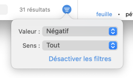 Quand les champs lexicaux sont affichés en mode liste, le bouton à droite du filtre textuel permet de n’afficher que les mots qui expriment un sens négatif (vinasse et bibine dans le champ lexical du vin, par exemple), positif (nectar, finesse), fort (exquis, gourmand) ou faible (petit, parcelle). Pour retrouver l’affichage de tous les résultats, cliquez de nouveau sur le bouton des filtres, puis sur Désactiver les filtres.