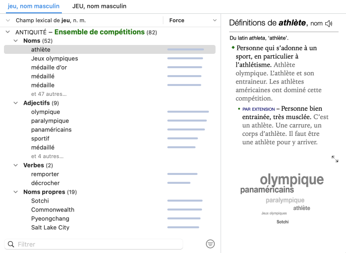 Le dictionnaire de champs lexicaux présente l’ensemble des mots sémantiquement apparentés au mot en vedette, regroupés par sens et classés par force relative. Il illustre le voisinage sémantique des mots et locutions et permet de naviguer à travers leur écheveau conceptuel.
