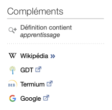 Après consultation d’une définition, vous pourriez vouloir pousser votre recherche plus loin, jusque dans la dimension encyclopédique. À cette fin, Antidote offre, sous la rubrique Compléments du panneau des précisions d’un nom commun ou d’un nom propre, ainsi que dans la section Compléments de la bulle d’informations de nombreuses locutions (bulle signalée par le bouton ⓘ), un lien de recherche vers l’encyclopédie en ligne Wikipédia. Notez que la case Wikipédia du réglage d’interface Compléments doit être cochée pour que ce lien de recherche soit affiché.