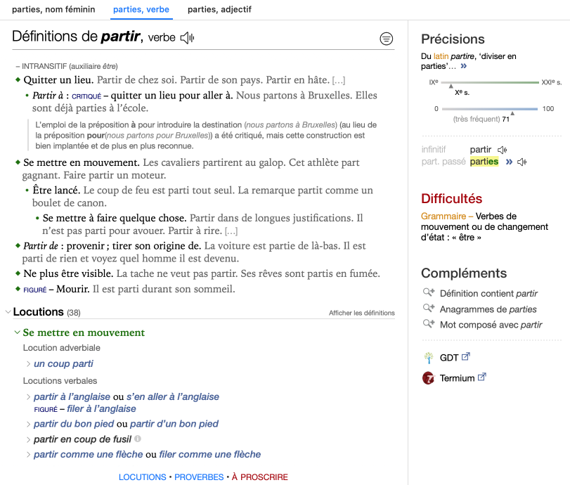 Le dictionnaire de définitions donne la définition des mots, locutions et proverbes de son imposante nomenclature. Les définitions, précises et riches en exemples, sont d’autant plus pratiques que chaque mot qui s’y trouve peut à son tour être consulté par doubleclic.