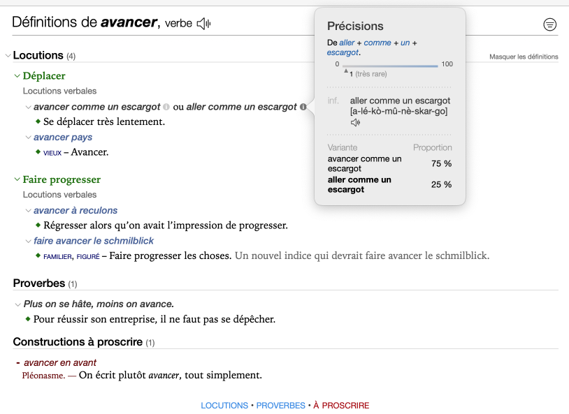 Le dictionnaire de définitions liste des expressions formées à partir de la vedette : des locutions (groupes syntaxiques figés ayant la même valeur grammaticale que leur mot noyau), des proverbes (formules populaires stéréotypées qui expriment une morale de façon imagée) et des constructions à proscrire. Ces trois types d’expressions, lorsqu’ils existent, sont accessibles par des liens situés au bas de la fenêtre.