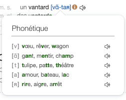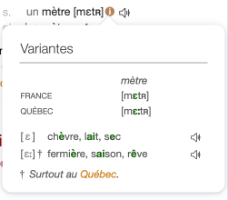 L’icône permet de faire prononcer le mot en entête et ses éventuelles formes fléchies, ainsi que les mots donnés en exemples pour les phonèmes de la transcription phonétique quand celle-ci est affichée. Ces éléments peuvent être prononcés avec une voix québécoise ou avec une voix française.