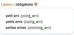 On trouve également dans cette zone du panneau des précisions la mention d’abréviations ou de symboles, ou encore des informations sur le caractère obligatoire ou non de la liaison ou de l’apocope avec le mot vedette. Par exemple, pour l’adjectif petit, il est mentionné que la liaison est obligatoire. Cliquez sur le à droite de cette mention pour voir les exemples de liaison petit ami, petits amis et petites amies accompagnés de leur transcription phonétique.