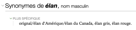 Les hyponymes sont des synonymes de sens plus spécifique que le mot en vedette. Par exemple, voiture a comme hyponymes berline, citadine, coupé, etc., qui sont des types particuliers de voitures. Les hyponymes sont introduits par la mention plus spécifique et sont indentés à droite d’un filet vertical. Un chevron de dévoilement permet de les afficher ou de les masquer (le nombre d’hyponymes masqués est alors indiqué).