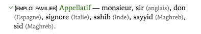 Chaque sous-sens (nuance de sens ou d’emploi) est indenté sous son sens principal et introduit par un point gras vert (●).