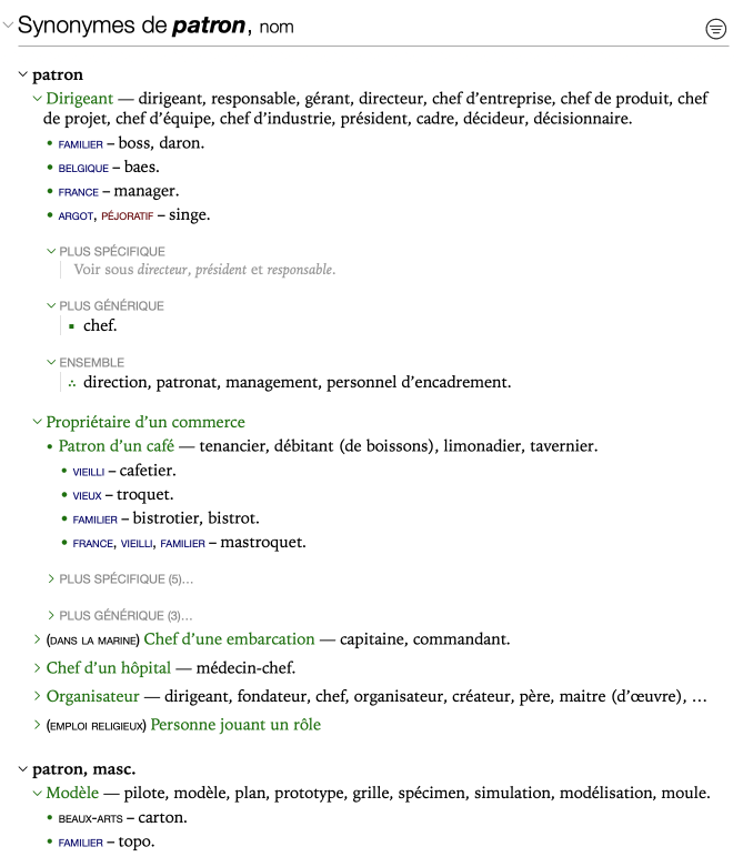 Les synonymes sont groupés par sens. Chaque groupe est introduit par un chevron qui module l’affichage des listes de synonymes pour chaque sens. Il alterne entre un affichage exhaustif, pratique pour une recherche approfondie du sens voulu, et un affichage sommaire, plus utile lors d’un survol. Le même symbole situé dans l’entête permet de commander d’un seul clic le dévoilement de toutes les listes. Lorsque la vedette a plus d’un sens possible, une courte étiquette en vert spécifie le sens visé.