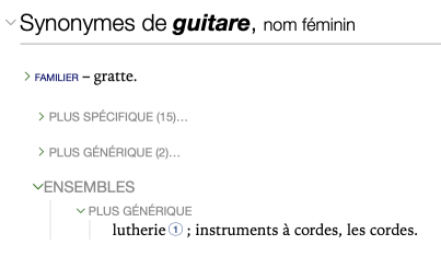 Lorsqu’un hyponyme (ou un hyperonyme) affiché possède lui-même des hyponymes, le nombre de ceux-ci est indiqué dans un petit cercle affiché à sa droite. Un clic sur le cercle dévoile la liste complète de ses hyponymes. Le processus peut être récursif si certains de ceux-ci possèdent eux-mêmes des hyponymes. Vous pouvez ainsi naviguer dans la hiérarchie sémantique et trouver facilement le terme précis qui vous échappe, ou encore élargir vos connaissances en explorant les diverses familles sémantiques.