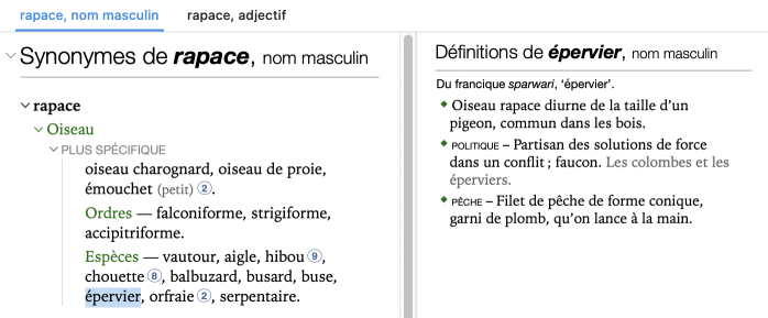 Le panneau de droite affiche les définitions des synonymes sélectionnés. En ayant à la fois les synonymes et leur définition sous les yeux, vous pouvez trouver rapidement le synonyme qui vous convient.