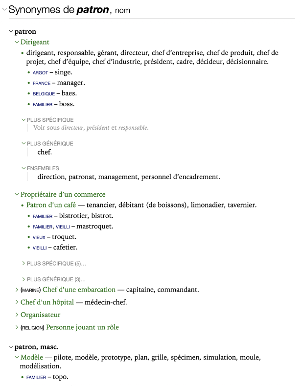 Les synonymes sont groupés par sens. Chaque groupe est introduit par un chevron qui module l’affichage des listes de synonymes pour chaque sens. Il alterne entre un affichage exhaustif, pratique pour une recherche approfondie du sens voulu, et un affichage sommaire, plus utile lors d’un survol. Le même symbole situé dans l’entête permet de commander d’un seul clic le dévoilement de toutes les listes. Lorsque la vedette a plus d’un sens possible, une courte étiquette en vert spécifie le sens visé.