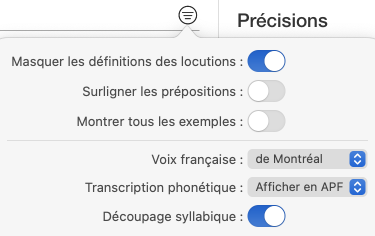 Le bouton à droite de l’entête dans les dictionnaires de définitions, de synonymes et de conjugaison permet de configurer l’affichage de certains contenus selon le dictionnaire concerné (transcriptions phonétiques, marques dans les synonymes, prépositions dans les exemples, etc.). Les options de configuration propres à chaque dictionnaire sont décrites aux sections correspondantes.