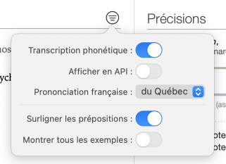 Le bouton à droite de l’entête dans les dictionnaires de définitions, de synonymes et de conjugaison permet de configurer l’affichage de certains contenus selon le dictionnaire concerné (transcriptions phonétiques, marques dans les synonymes, prépositions dans les exemples, etc.). Les options de configuration propres à chaque dictionnaire sont décrites aux sections correspondantes.