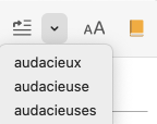 Cliquez sur le bouton (Mac) ou sur Remplacer (Windows) ou encore dans le menu contextuel pour remplacer ce qui est sélectionné dans votre texte par ce qui est sélectionné dans les dictionnaires. Si la sélection ne convient pas à votre texte, cliquez sur le menu déroulant des formes proposées pour faire afficher la liste de celles-ci et sélectionnez la forme qui convient. Vous pouvez par exemple remplacer un mot de votre texte par un synonyme, par une locution, par un mot de la même famille ou par la rime parfaite.