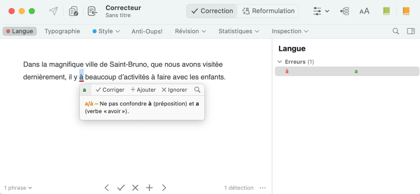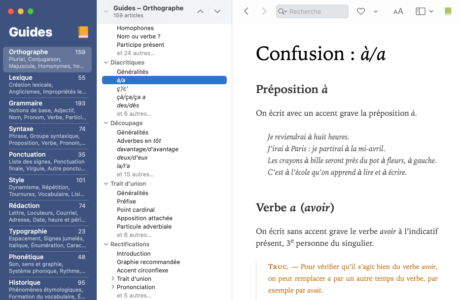 À partir du correcteur, l’accès aux guides est contextuel, c’est-à-dire qu’Antidote ouvre les guides sur l’article précis qui s’applique à la détection courante. Pour le consulter, sélectionnez une détection, puis effectuez l’une ou l’autre des actions suivantes :