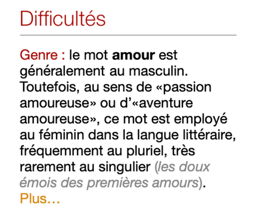 Le panneau des précisions du dictionnaire de définitions offre souvent des hyperliens en orangé : un clic sur ces hyperliens ouvre les guides sur des articles qui concernent le mot en vedette; un clic sur une marque d’usage (ex. : familier) dans le corps de la définition ouvre un article décrivant cette marque.